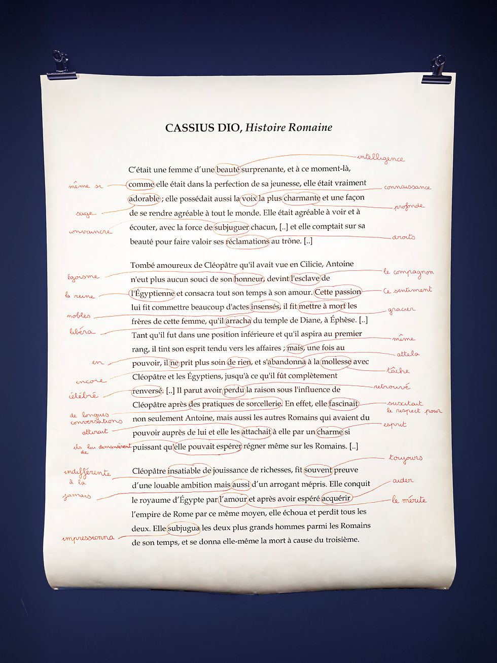 The artist took three text from Roman historians Plutarch, Flavius Joseph and Cassius Dio that describe Cleopatra and her relationship with Marc Anthony. The three text, all written after the death of both rulers, depict a very negative portrait of Cleopatra - the manipulative temptress that used her charms to manipulate every man including Marc Anthony - a portrait that fit in the narrative of that time time that wanted to clear the betrayal the past Roman emperor by putting all the blame on his Egyptian lover.