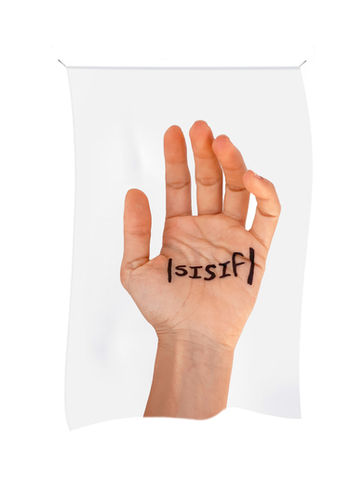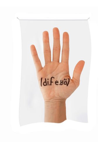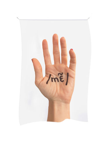 Sound wave is a body of 13 nylon flags where are printed on a white background photographs on the palm of the artist' hands. On each hand is written, in the International Phonetic Alphabet (IPA), the phonetic writing of thirteen words. Kosmatopoulos selected words that belong to the realm of linguistic theories such as "mot" ("word"), "lettre" ("letter") or "son" ("sound") but also words more personal to her - words she loves like "barbare" ("Barbarian") or words she always had a hard time spelling correctly such as "Sisyphe" ("Sisyphus").