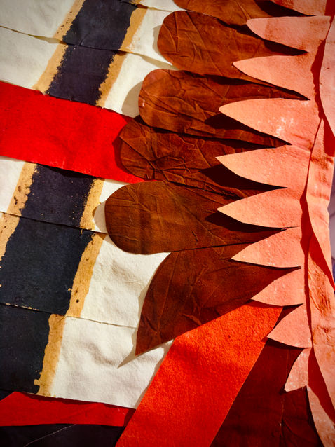 Hand-dyed layered canvas, gold leaf, natural pigments, rope, sandbag