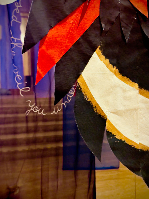 Each wing is constructed from layered canvas altered through gradual pigment processes, forming stratified surfaces where colour and opacity accumulate. This material layering introduces time, erosion and transformation, as if the wing were not an object but the trace of a passage.